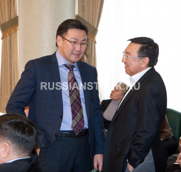 Улан-Удэ, 11 декабря 2012. 52-сессия Улан-Удэнского городского совета депутатов, на которой был избран мэром Улан-Удэ председатель горсовета Александр Голков. На снимке: Иринчей Матханов и Игорь Зураев.