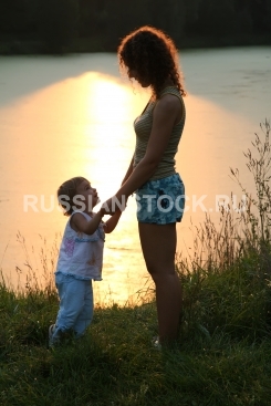 Мать и ребенок на берегу на фоне заката