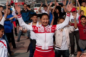 Улан-Удэ, 10 августа 2012. Массовая зарядка на площади Советов с участницей Олимпийских игр в Лондоне Инной Степановой.
