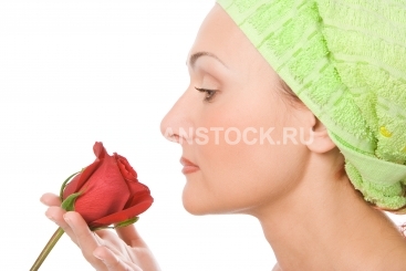 Портрет девушки с розой на белом фоне.
