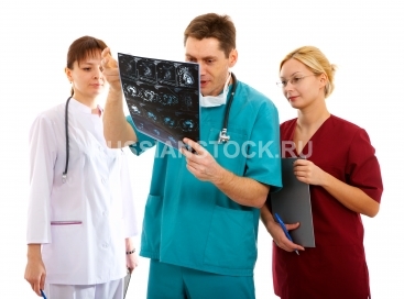 Бригада врачей изучает томограмму.