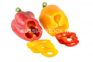 Нарезанный перец Red and yellow sweet pepper lays on a chopping board.