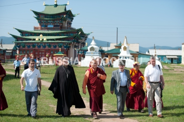 Улан-Удэ, 1 августа 2012. Протоиерей Всеволод Чаплин и Пандидо Хамбо-лама Дамба Аюшеев, глава буддийской традиционной Сангхи России, в Иволгинском дацане.