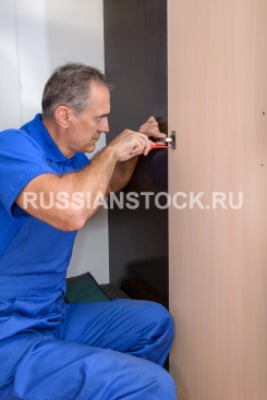 Сборщик мебели устанавливает платяной шкаф.