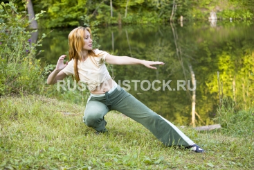 Женщина делает зарядку на берегу водоема