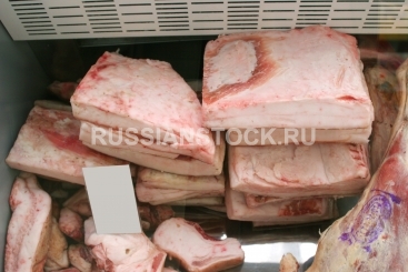 Куски свежего сала на прилавке.