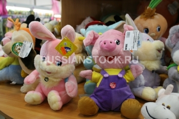 Торговые стеллажи с мягкими игрушками в магазине.