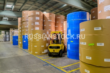 Storehouse of paper in rolls of different color.