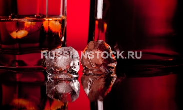 Два кубика льда и стакан виски на столе. Two ice cube and whiskey on glass table