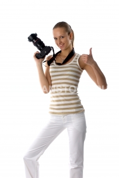 Девушка с профессиональным фотоаппаратом на белом фоне