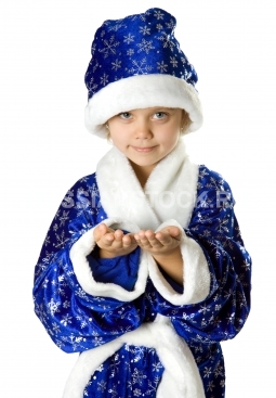 Девочка в костюме Деда Мороза на белом фоне