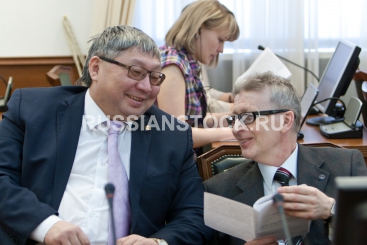 Улан-Удэ, 19 марта 2013. /20130319R1/. Совет по взаимодействию с религиозными объединениями при главе РБ. На снимке: Эдуард Николаев и Сергей Лепехов из Института монголоведения, буддологии, тибетологии СО РАН.