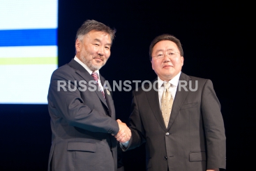 Улан-Удэ, 15 июля 2010. Заседание IV генеральной сессии Конвента монголов мира. На снимке: Баир Бальжиров, заместитель председателя правительства Республики Бурятия по социальному развитию, и президент Монголии Цахиагийн Элбэгдорж.