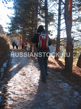 Зимний Кавказ. Туристы идут по горной тропе.