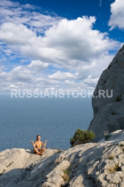 Женщина занимается медитирует на фоне моря