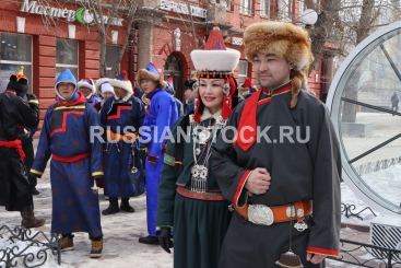 Улан-Удэ, 20 февраля 2026. Дэгэлфлешмоб - участники акции в бурятских костюмах прошли по улицам города, приуроченный к Году единства народов России